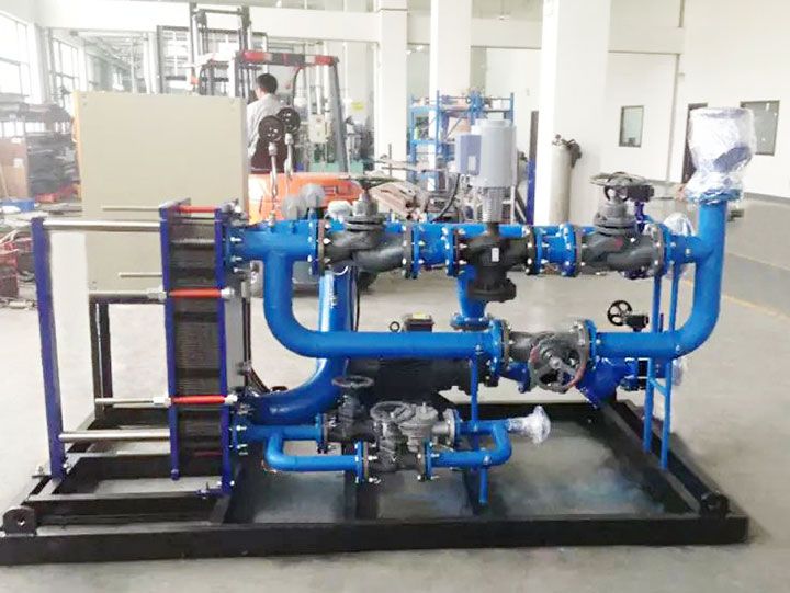 換熱機組由板式換熱器、智能溫控裝置、電控裝置、循環泵、補水泵、穩壓膨脹水箱、補(凝)水箱、過濾器、閥門、儀表、傳感器、配管底座等組成。